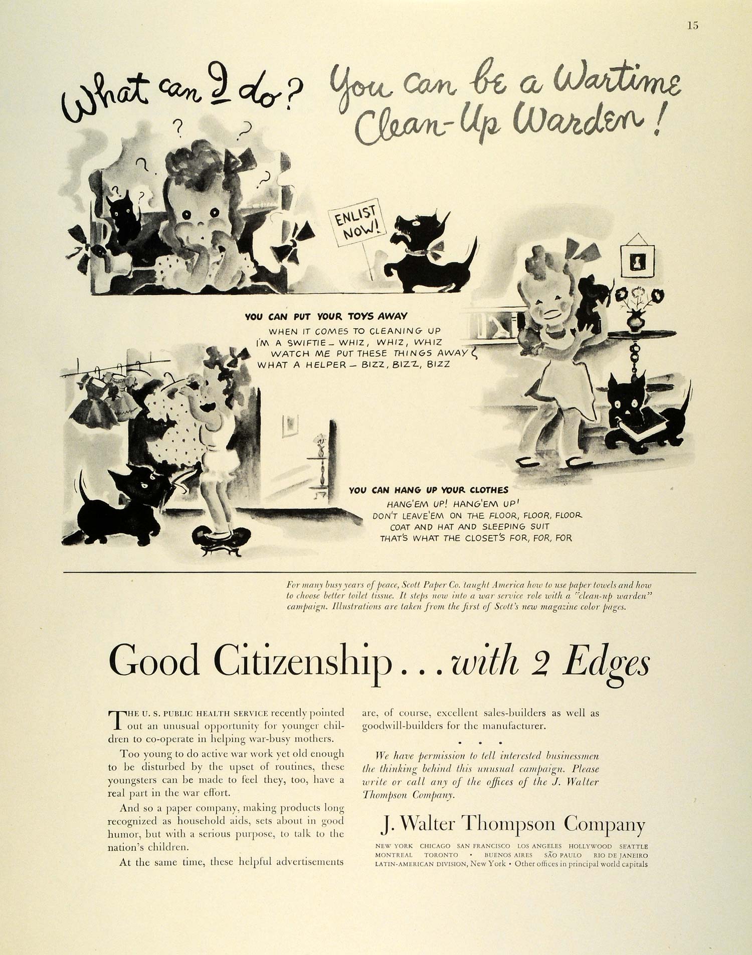 This is an original 1942 World War II black and white print ad from the J. Walter Thompson Company, encouraging American children to do their part as "Clean-Up Wardens."