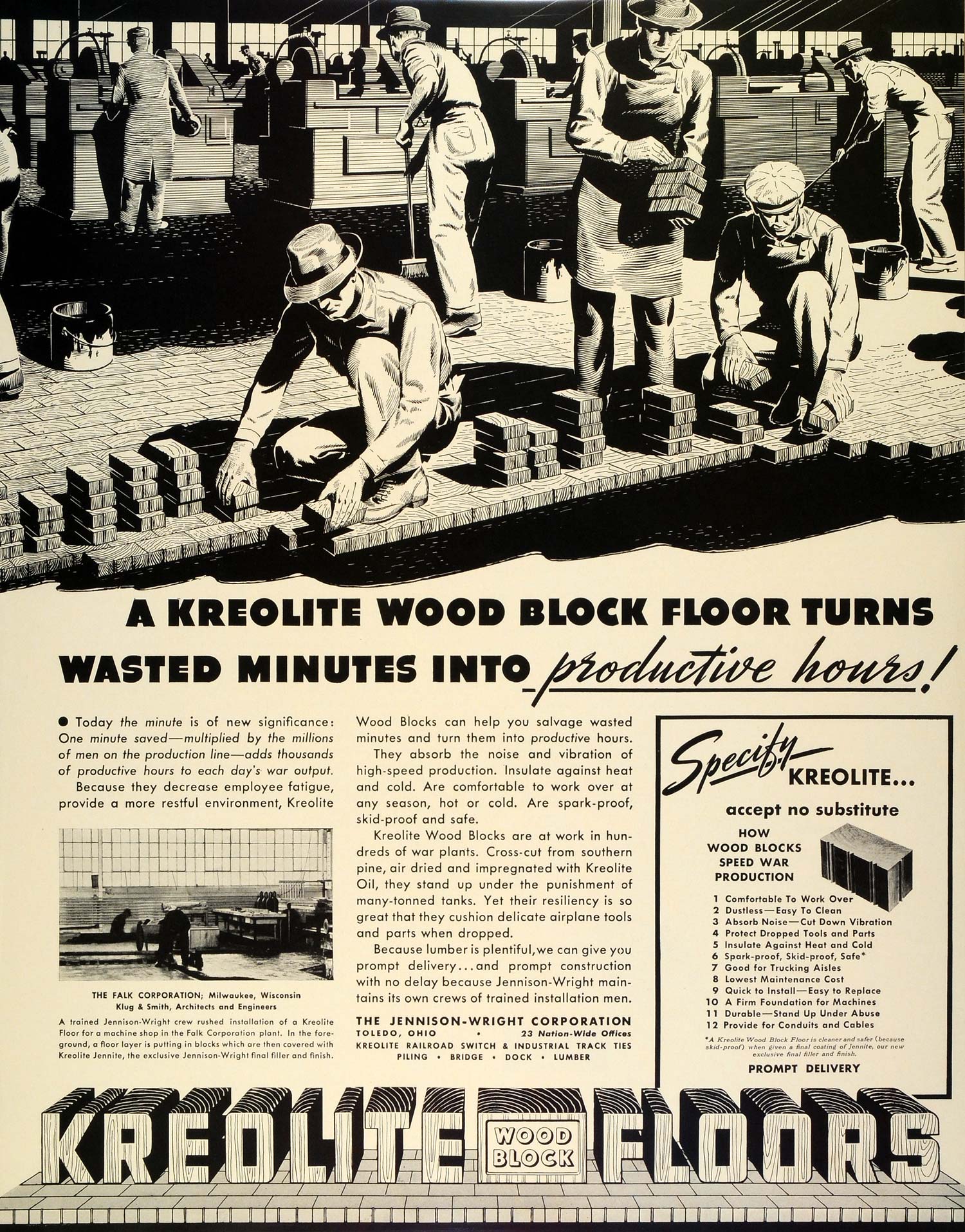 This is an original 1942 World War II black and white print ad for Kreolite Wood Block Floors, a product by The Jennison-Wright Corporation of Toledo, Ohio. This company is doing its part in war efforts by providing wartime production plants and factories with insulating, noise-reducing, comfortable, spark-proof and skid-proof flooring. This ad features The Falk Corporation of Milwaukee, Wisconsin, who have installed the company's flooring.