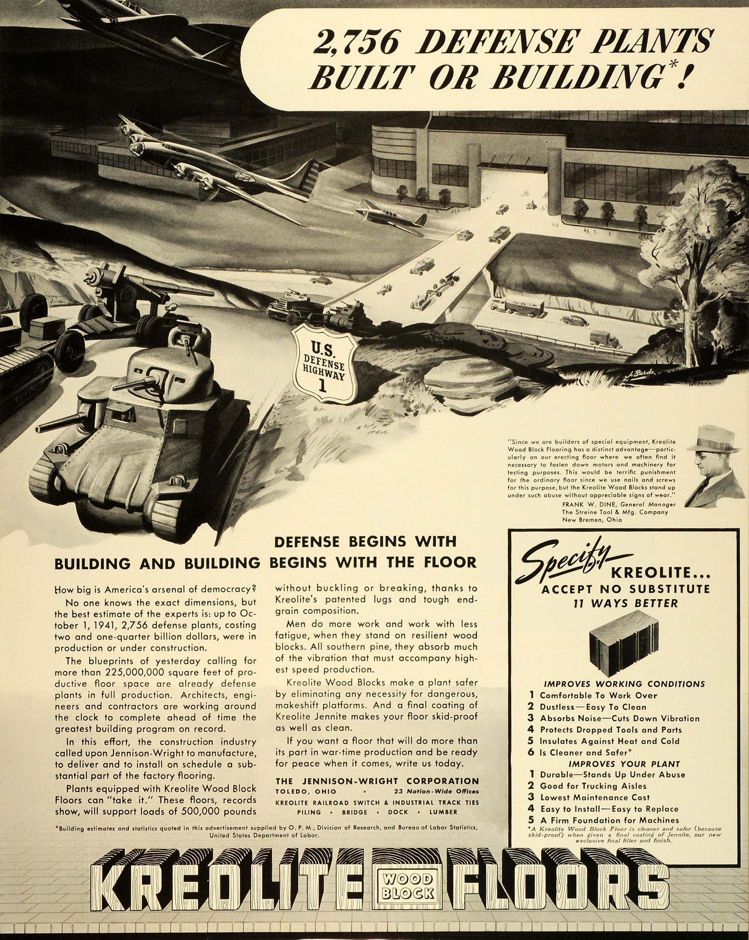 This is an original 1942 World War II black and white print ad for Kreolite Wood Block Floors, a product line by The Jennison-Wright Corporation of Toledo, Ohio, who are doing their part to aid in the war production efforts by manufacturing a surplus of their flooring for use in war production factories. This ad features artwork by J. Burda.