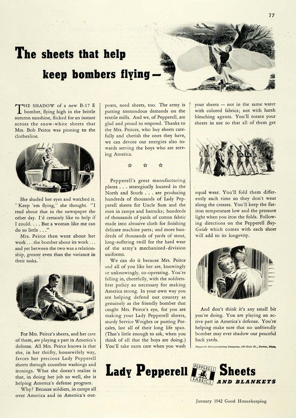 This is an original 1942 black and white print ad for sheets, blankets and fabrics by the Pepperell Manufacturing Company, located at 160 State Street, Boston, Massachusetts.