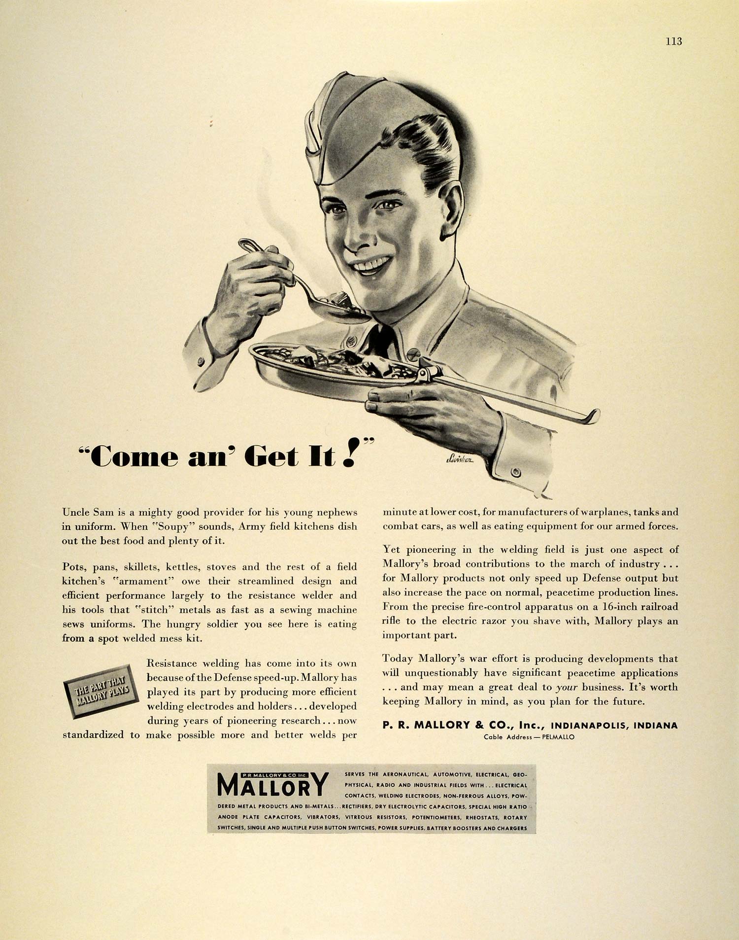 This is an original 1942 World War II black and white print ad for P. R. Mallory and Company of Indianapolis, Indiana. This ad features artwork by V. M. Swisher.