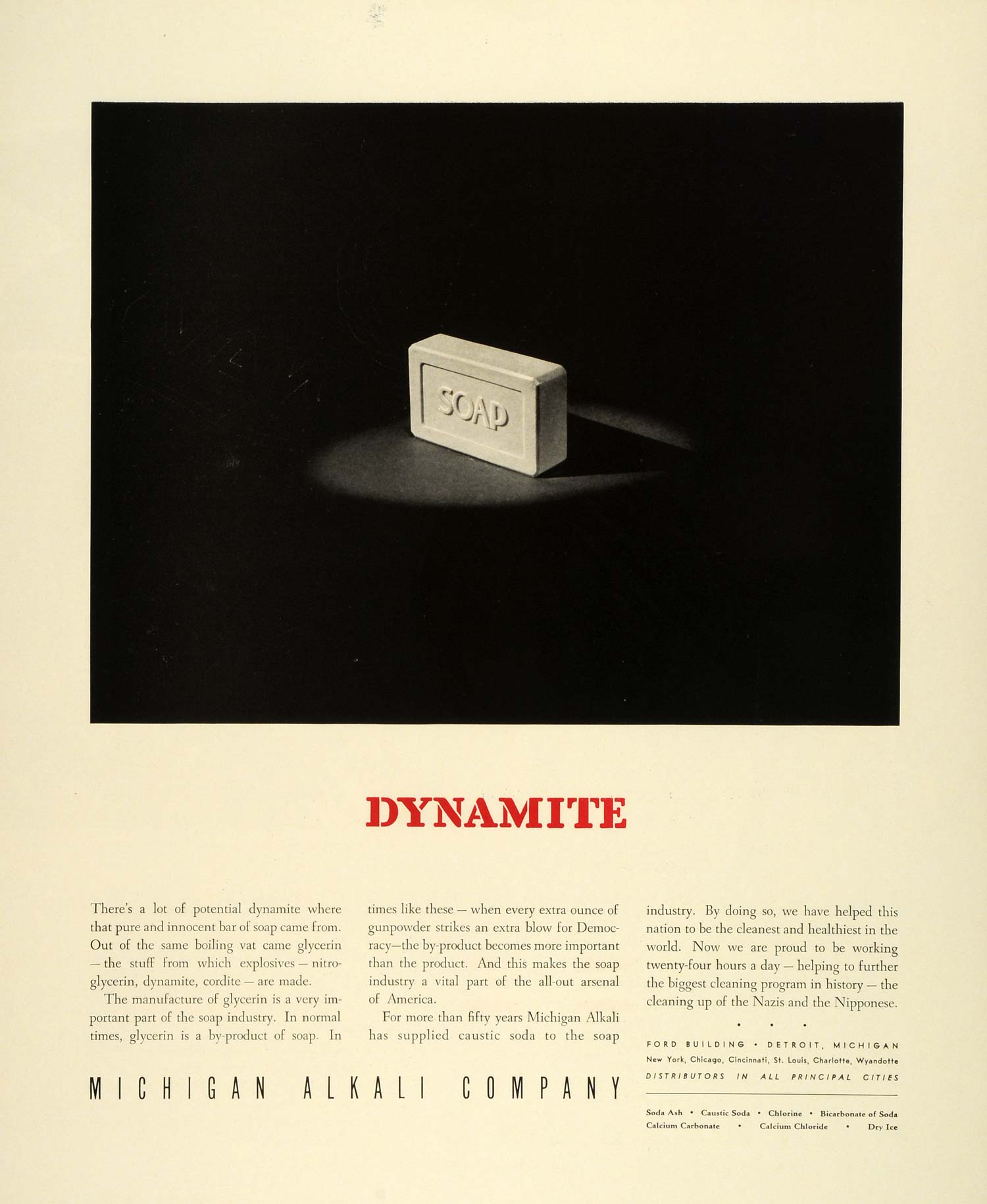 This is an original 1942 two-color print ad for the Michigan Alkali Company of the Ford Building in Detroit, Michigan (as well as New York, Chicago, Cincinnati, St. Louis, Charlotte, and Wyandotte). This ad features their glycerin and caustic soda in the World War II American production of dynamite.