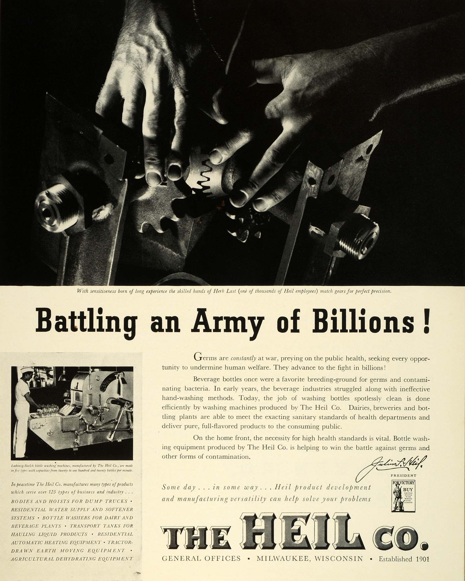 This is an original 1942 World War II black and white print ad for The Heil Company of Milwaukee, Wisconsin, who are doing their part to aid in the war production efforts by manufacturing a surplus of bottle washing equipment to prevent the spread of illness among able bodied war production workers.