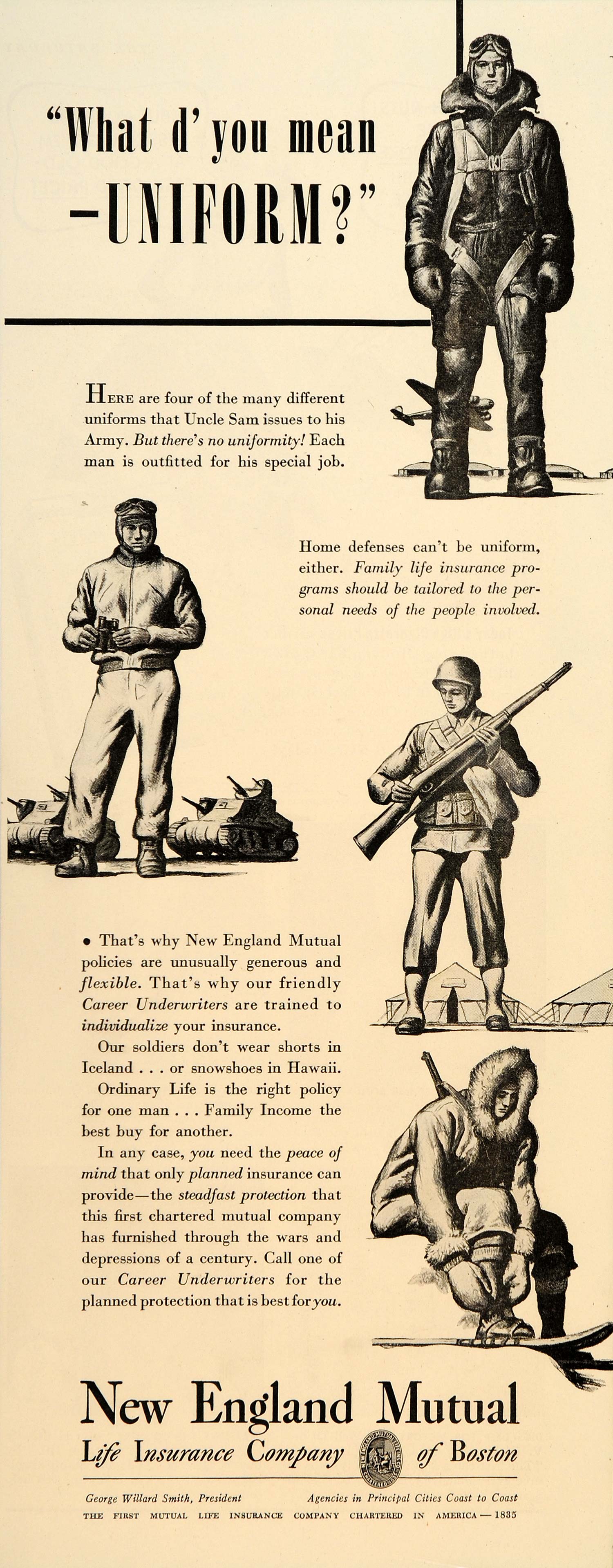 Keywords specific to this image: Uniform, War, New England Mutual, Boston, Career Underwriters, Insurance, Uncle Sam, Family Life, George Willard Smith, Life Insurance Company of Boston Vintage Advertising