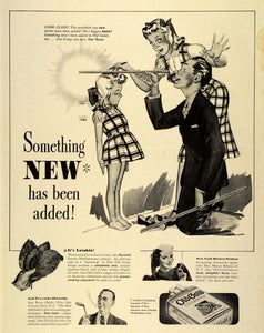 This is an original 1942 World War II Era black and white print ad for Old Gold Cigarettes, a product line by the P. Lorillard Company. This particular ad features Golf Pro Bruce Heatly of Echo Lake Country Club in New Jersey, as well as Mrs. Mason Britton of New York. This ad is promoting its new ingredient: Latakia Mediterranean Tobacco.