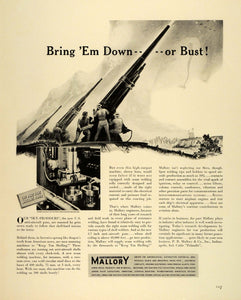 This is an original 1942 World War II black and white print ad for P. R. Mallory and Company of Indianapolis, who are doing their part to aid in the war production efforts by manufacturing a surplus of their communication and intercommunication precision parts, as well as other critical instruments for use by the U. S. military and war production plants. This ad features artwork by Edward C. Smith.