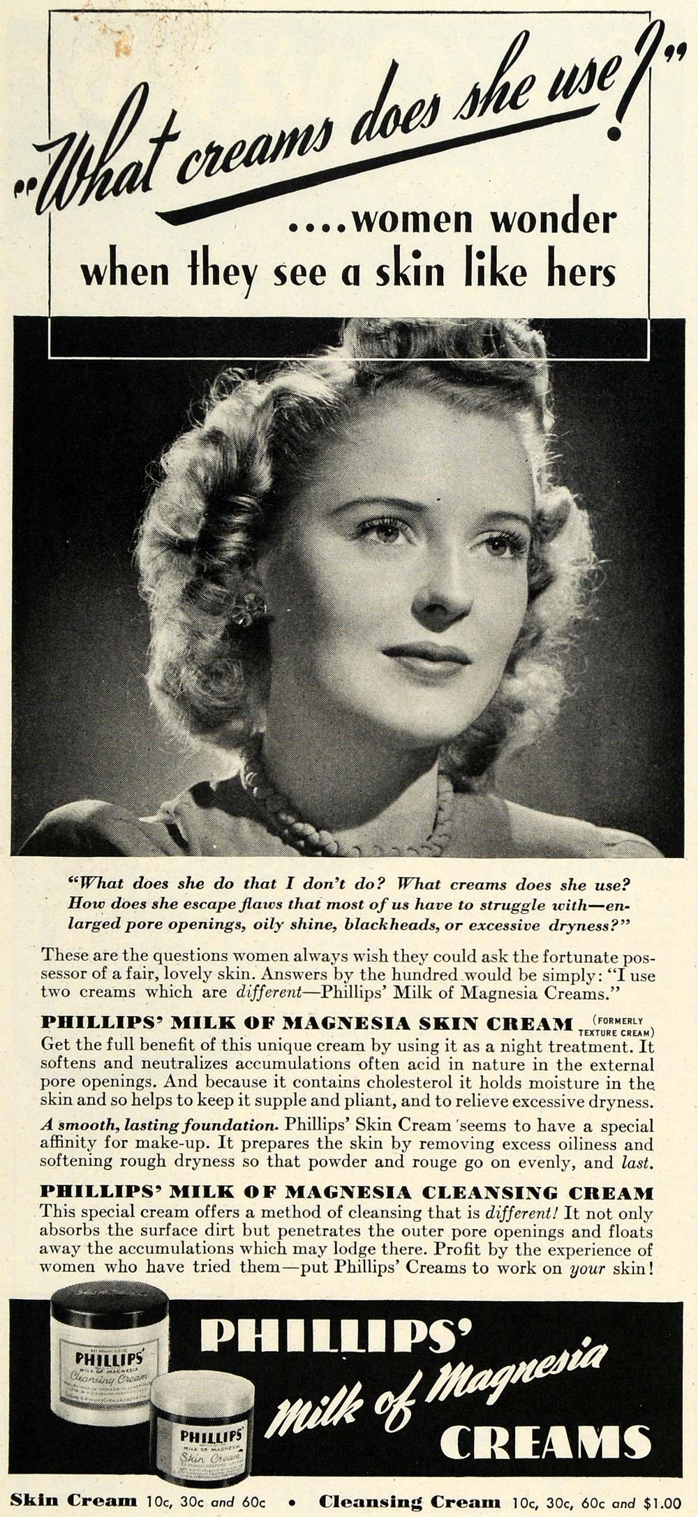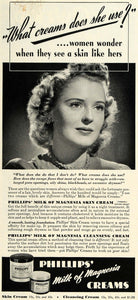 This is an original 1942 black and white print ad for Phillips' Milk of Magnesia Creams, skin cream and cleansing cream.