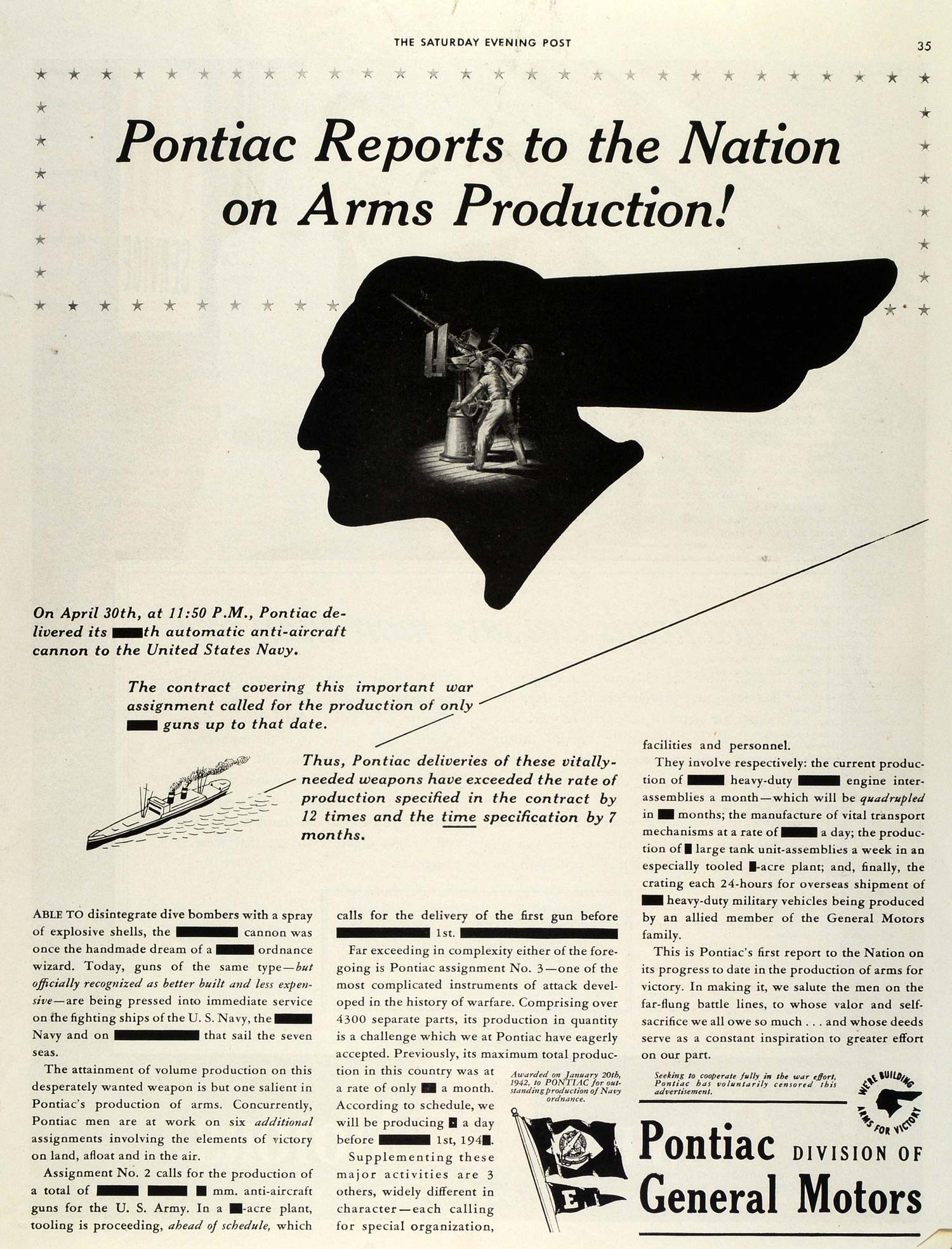 This is an original 1942 black and white print ad for Pontiac, the division of General Motors production of war materials including guns and cannons.