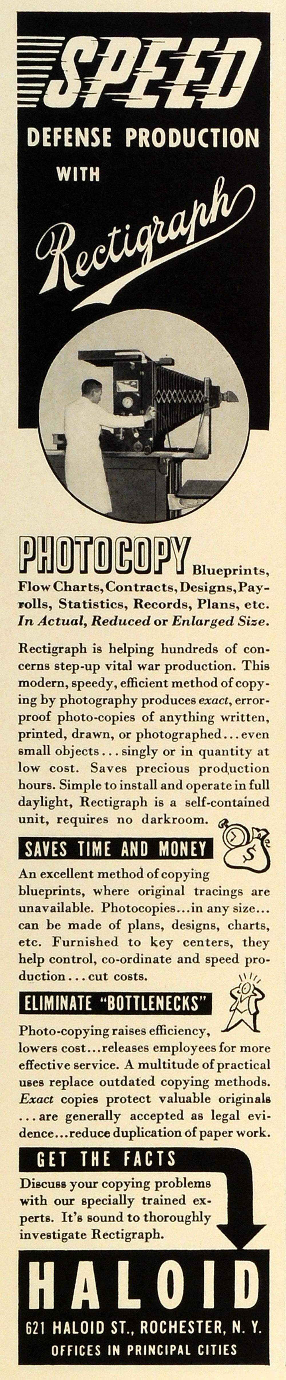 This is a small original 1942 black and white print ad for the Rectigraph photocopy machine by Haloid, located at 621 Haloid Street, Rochester, New York.