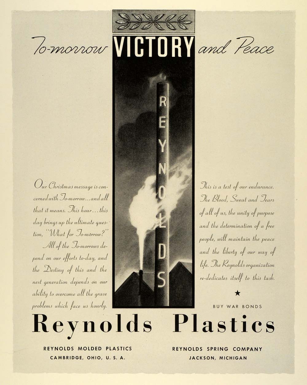 This is an original 1942 black and white print ad for Reynolds Plastics by Reynolds Molded Plastics of Cambridge, Ohio and Reynolds Spring Company of Jackson, Michigan.