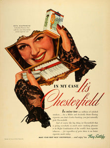 This is an original 1942 color print ad for Chesterfield Cigarettes by Liggett & Meyers Tobacco Company. This ad features Rita Hayworth, a Columbia Pictures Star.