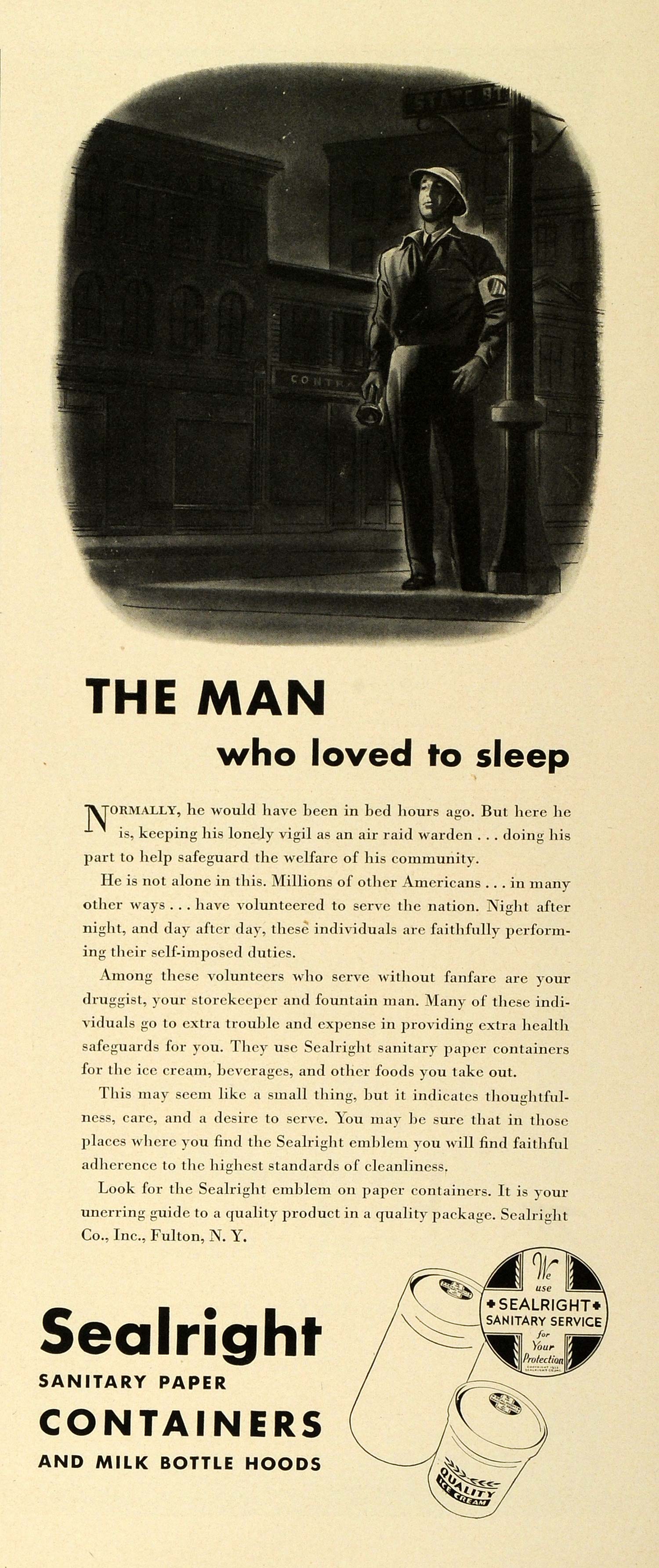 This is an original 1942 black and white print ad for the Sealright Company, Incorporated, of Fulton, New York. This ad features their Sealright Sanitary Paper Containers during the World War II era.
