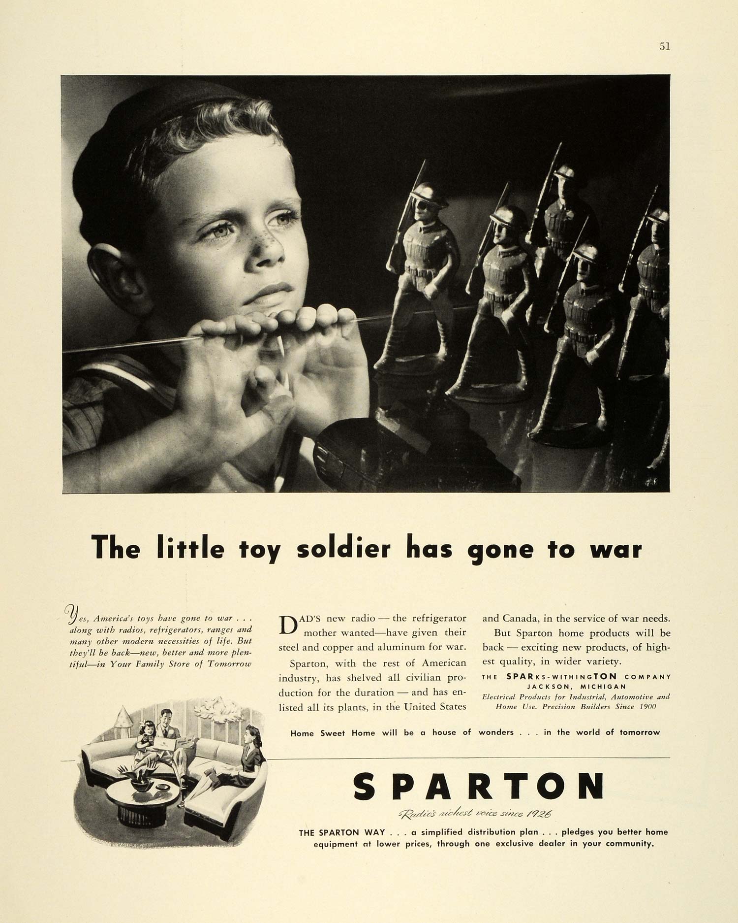 This is an original 1942 World War II black and white print ad for The Sparks Withington Company of Jackson, Michigan, who are doing their part to aid in the war production efforts by manufacturing wartime necessities in lieu of their usual household items, such as radio, refrigerators and more.