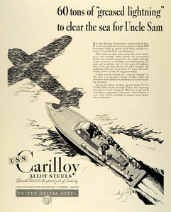 This is an original 1942 World War II black and white print ad for U. S. S. Carilloy Alloy Steels, a product by United States Steel.