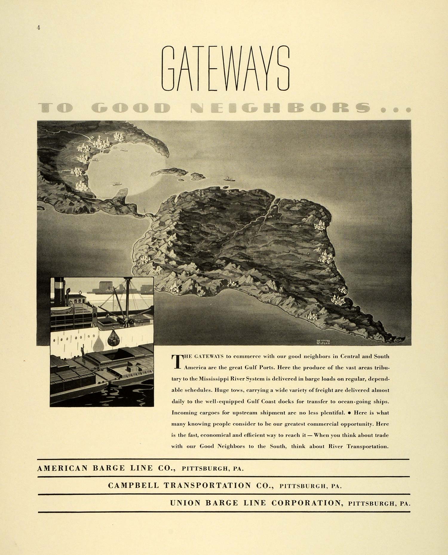 This is an original 1942 World War II black and white print ad for the American Barge Line Company, the Campbell Transportation Company and the Union Barge Line Corporation of Pittsburgh, who are doing their part to aid in the war production efforts by providing their boats for shipping wartime necessities. This ad features artwork by Wilson.