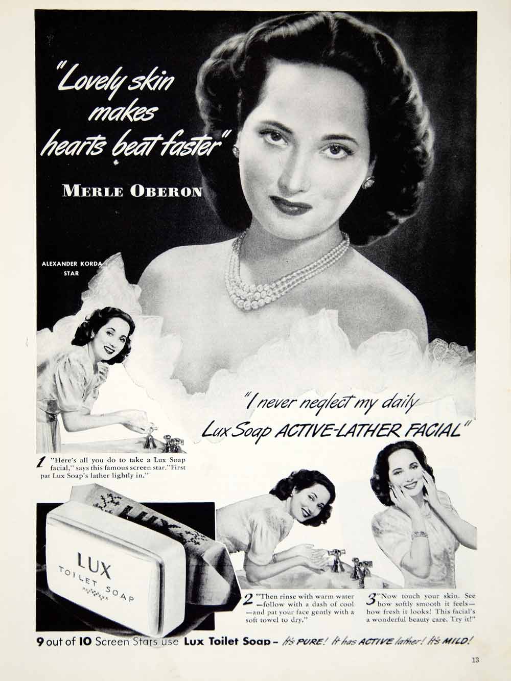 This is an original 1942 black and white print ad for Lux Toilet Soap featuring movie star, Merle Oberon.