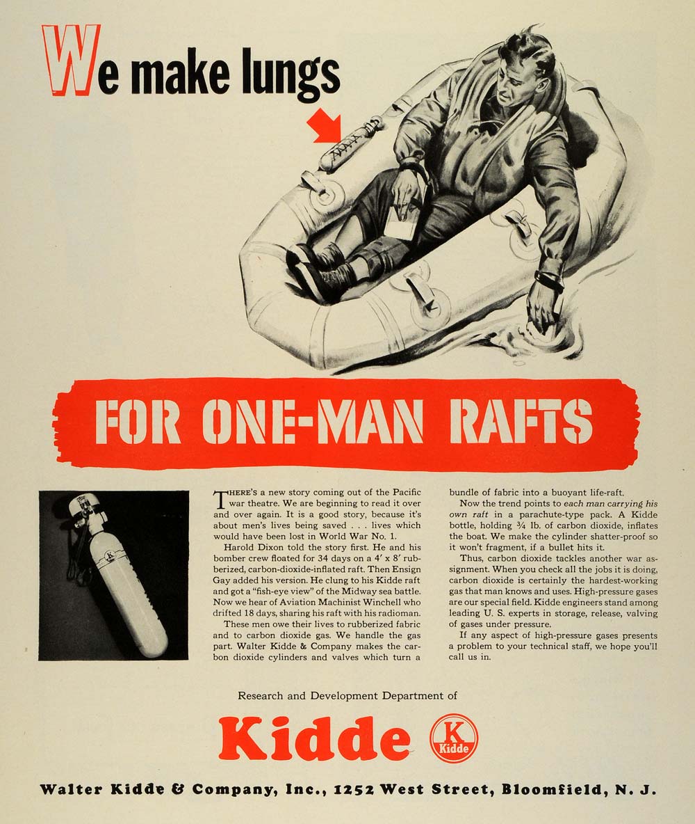 This is an original 1942 color print ad for carbon dioxide tackles by one-man rafts used during World War II. Walter Kiddie & Company, Inc. is located at 1252 West Street, Bloomfield, New Jersey.