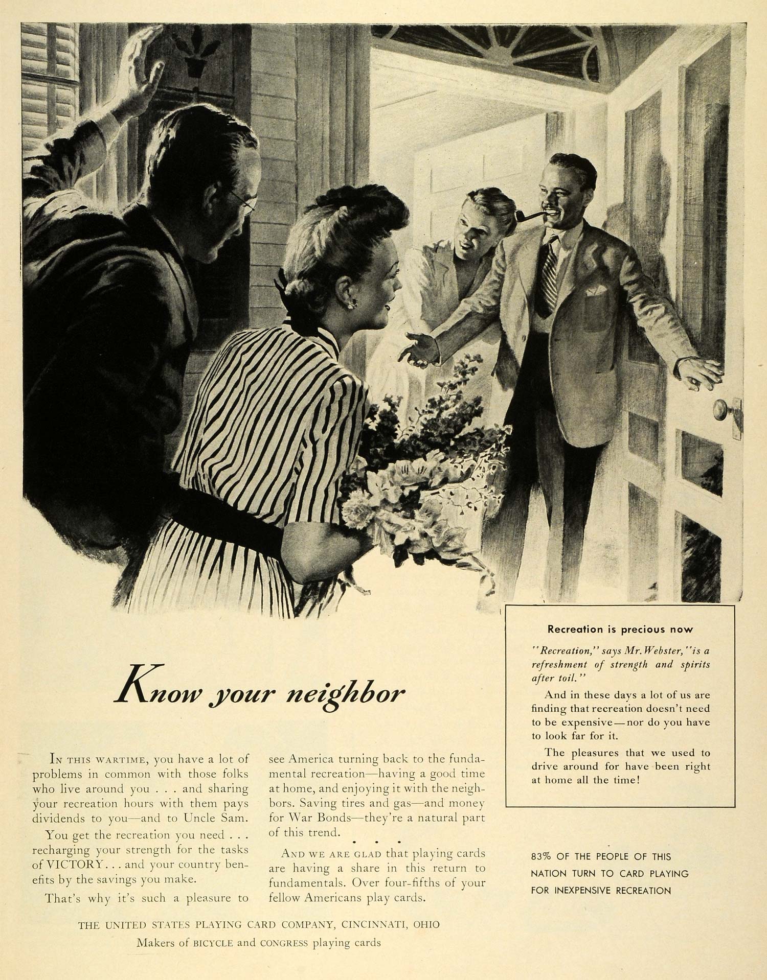 Keywords specific to this image: Vintage Advertising, recreation, know your neighbor, at home entertainment, save war resources, wartime, war effort