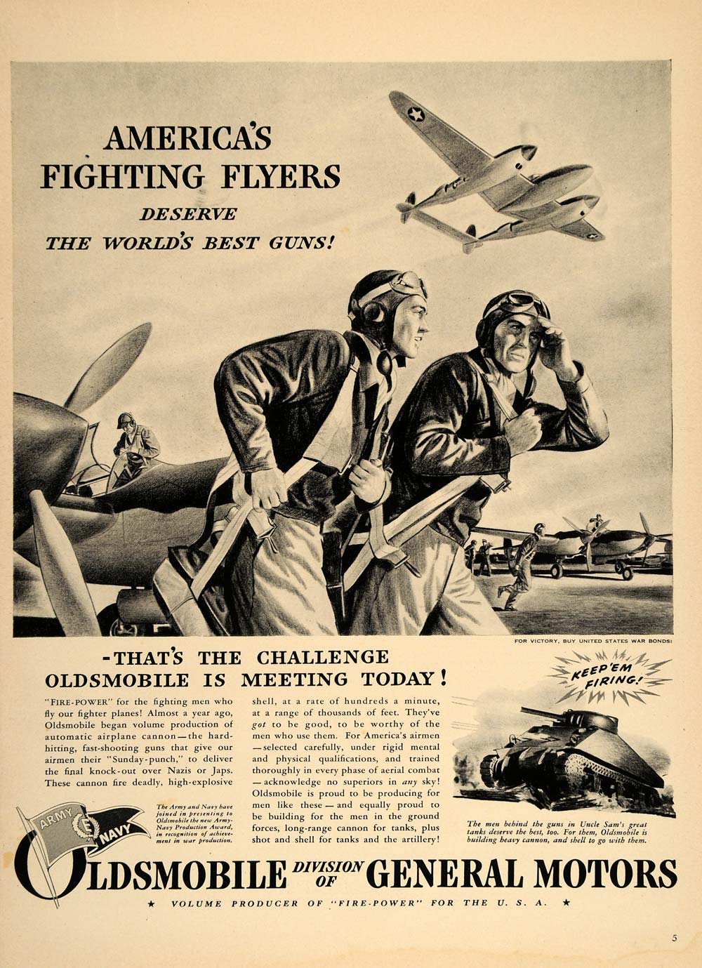 This is an original World War II era ad for Oldsmobile Division of General Motors Corporation. The ad illustrates Air Force fighter planes and Army tanks built by Oldsmobile.