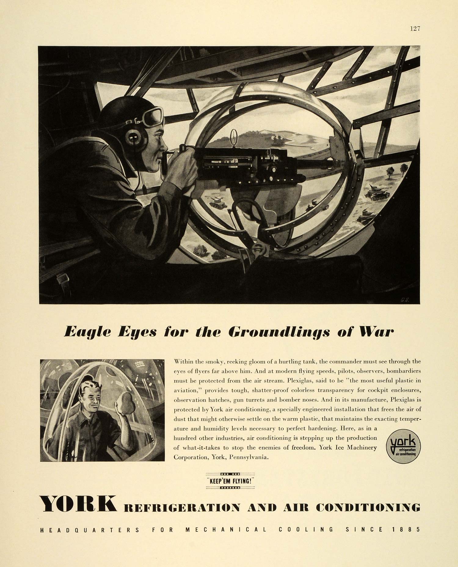 This is an original 1942 World War II black and white print ad for the York Refrigeration and Air Conditioning division of the York Ice Machinery Corporation of York, Pennsylvania. This company is doing their part to aid in the war production efforts by manufacturing a specially engineered air conditioned design installed in Plexiglas to avoid dust buildup on the pilot's cockpit view.