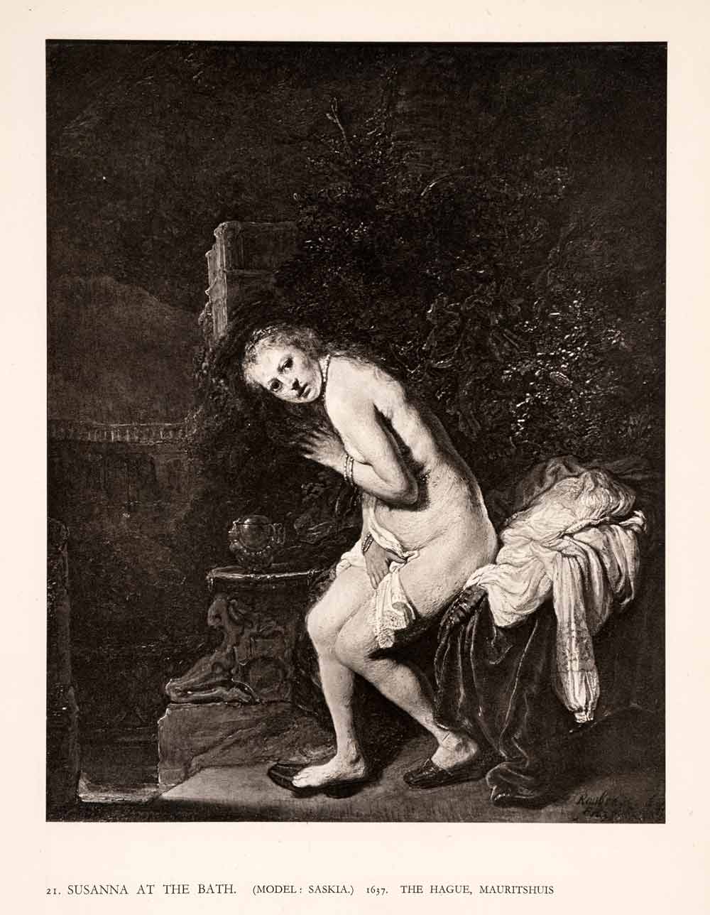 This is an original 1942 black and white photogravure of "Susanna at the Bath." The original artwork is estimated to have been painted in 1637, and had been held in the Mauritshuis in The Hague.