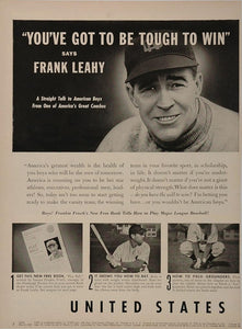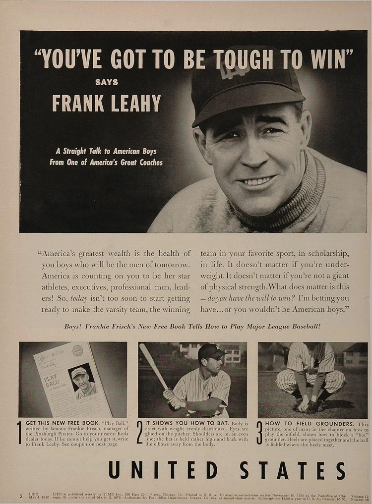 This is an original 1942 black and white print ad for the new free book Play Ball by the manager of the Pittsburgh Pirates, Frankie Frisch.