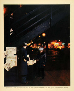 This is an original 1942 color print of two men with newspapers in Chicago's Loop. The caption writes, "Chicago's Loop, main battlefield in the Field-McCormick war, was quiet on the first night. The newspaper headlights write, "Revolt Grows in Serbia: Labor to Ask Murphy Ouster." Seen in the background is Maurice's Restaurant.