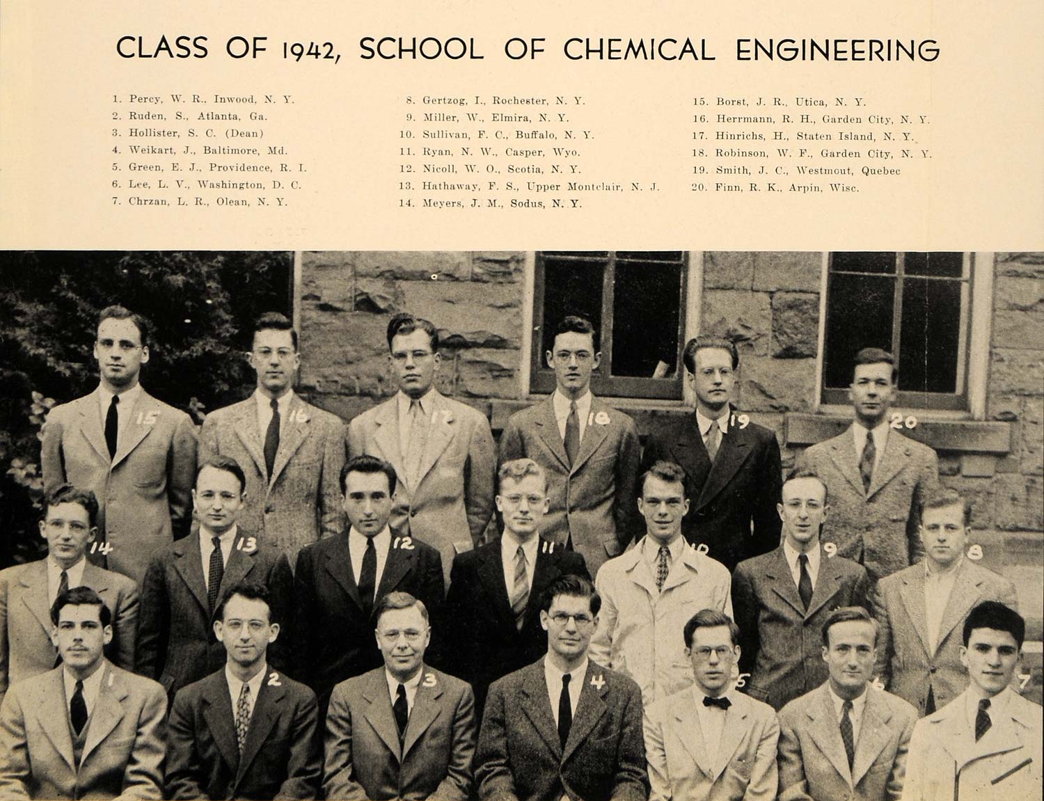 This is an original 1942 halftone print of the Class of 1942 from the School of Chemical Engineering at Cornell University, an Ivy League university located in Ithaca, New York.