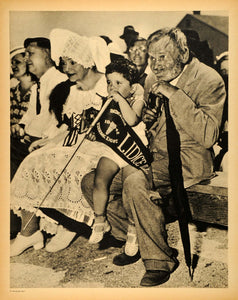 This is an original 1942 halftone print of a family at the Dedication of Eternal Light to commemorate Lidice, Czech Republic. The village is located northwest of Prague and was completely destroyed by German forces in the spring of 1942, after Czech and Slovak soldiers attacked and killed Reinhard Heydrich of the Third Reich. A new town was built on the site, and was named after the fallen city. Allied propaganda forces commemorated the city, and in September of 1942, coal miners founded "Lidice Shall Live," an organization to help raise funds for the rebuilding of the town after the war.
