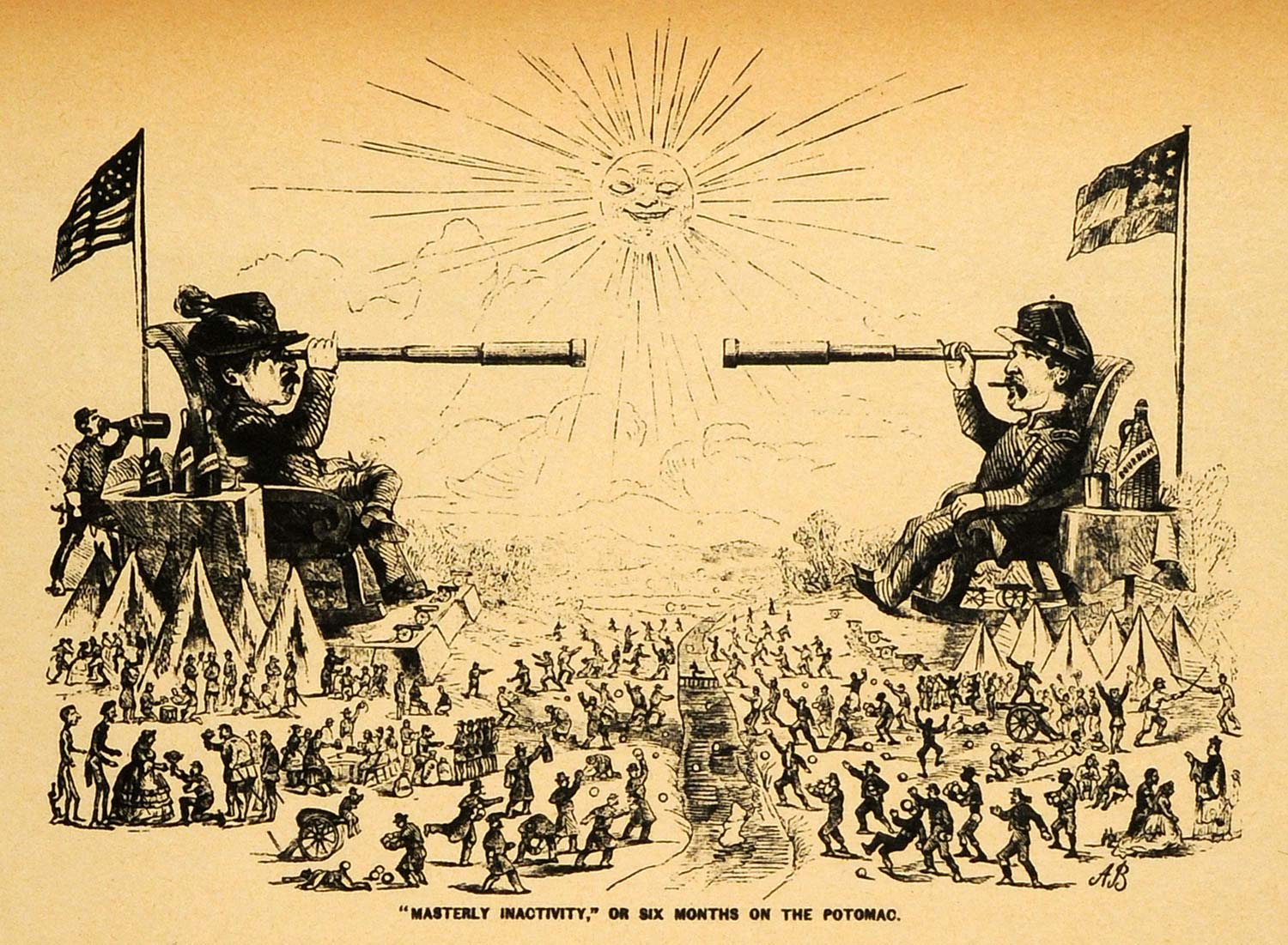 Illustrated Newspaper. The caption writes, "'Masterly inactivity,' or six months on the Potomac." Shown in the image are soldiers having a snowball fight, cannons, tents, bourbon jugs, and dozens of soldiers.