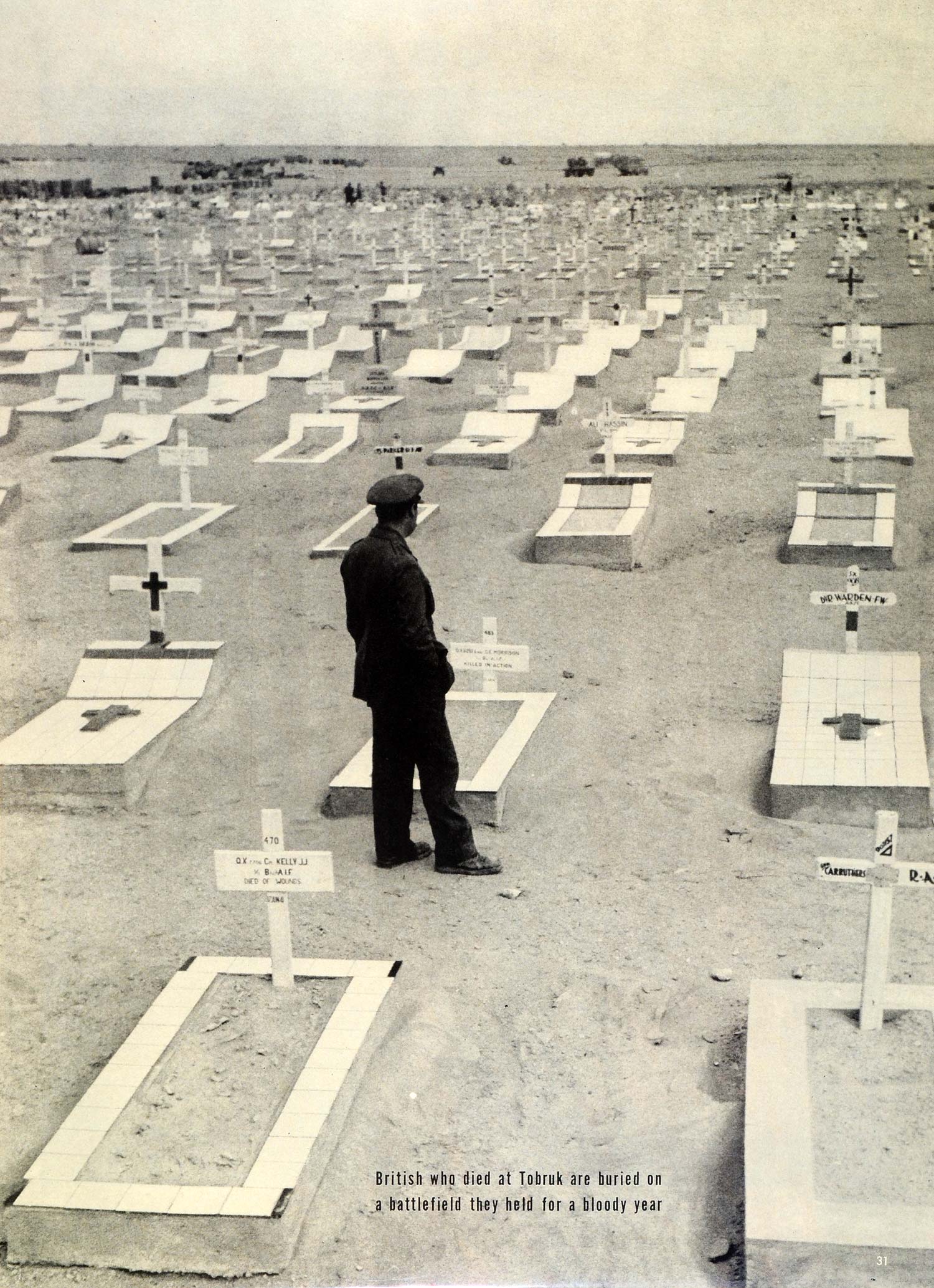 This is an original 1942 halftone print of the graves of the British Army, who died at Tobruk, Libya, have been painstakingly built of concrete, tittles, and white-painted crosses.