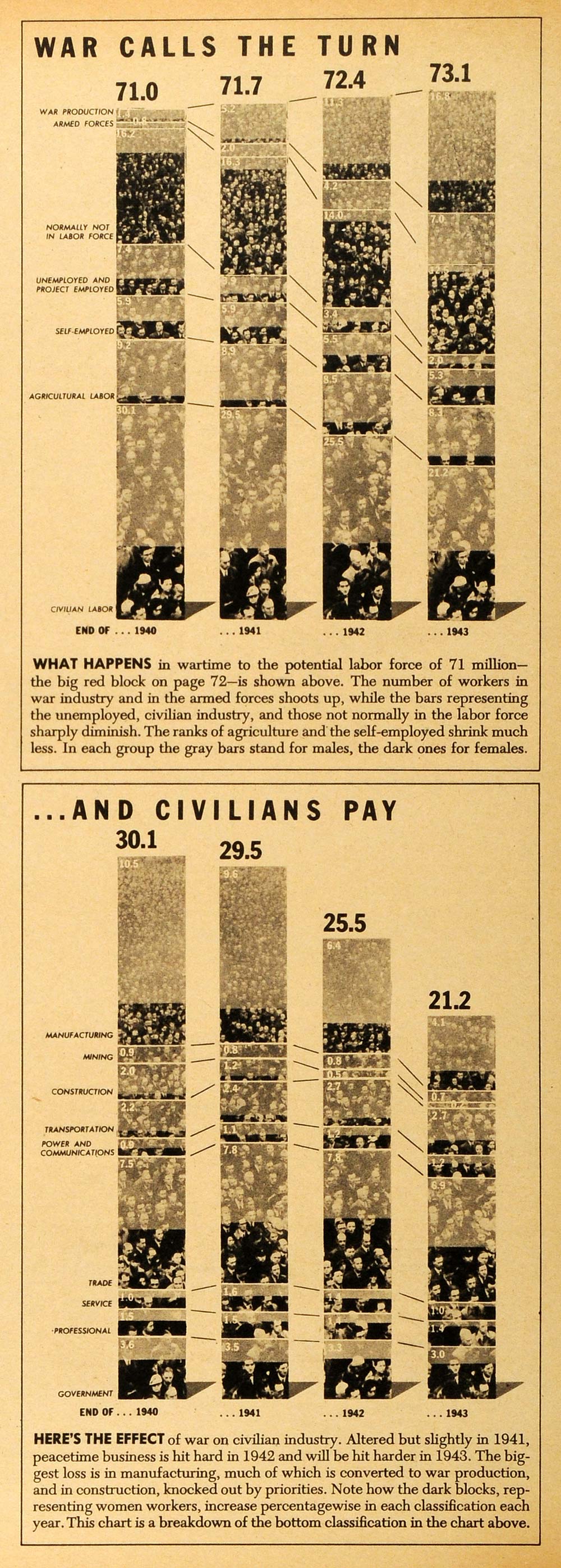This is an original 1942 halftone print charts titled, "War Calls the Turn and Civilians Pay." The caption begins, "Here's the effect of war on civilian industry. Altered but slightly in 1941, peacetime business is hit hard in 1942 and will be hit harder in 1943. Please note that page 72 is referenced in the caption, but it is not included with the listing.