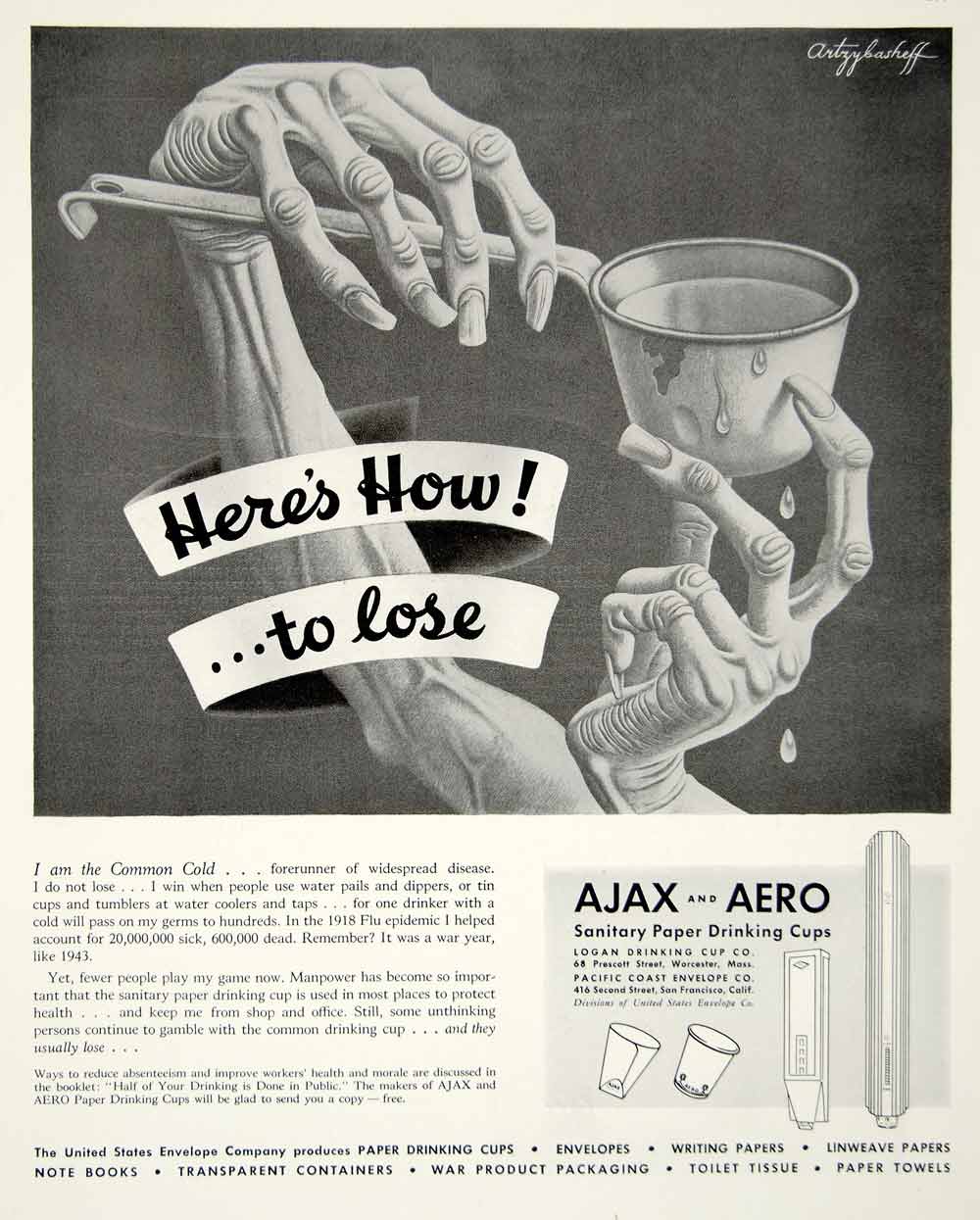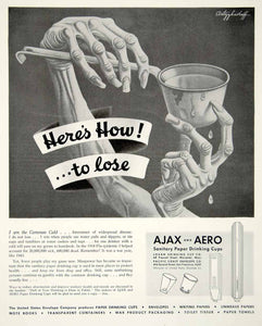 This is an original 1943 black and white print ad for Ajax and Aero disposable paper drinking cups, from Logan the Drinking Cup Company (68 Prescott Street, Worchester, Massachusetts) and the Pacific Coast Envelope Company (416 Second Street, San Francisco, California).
