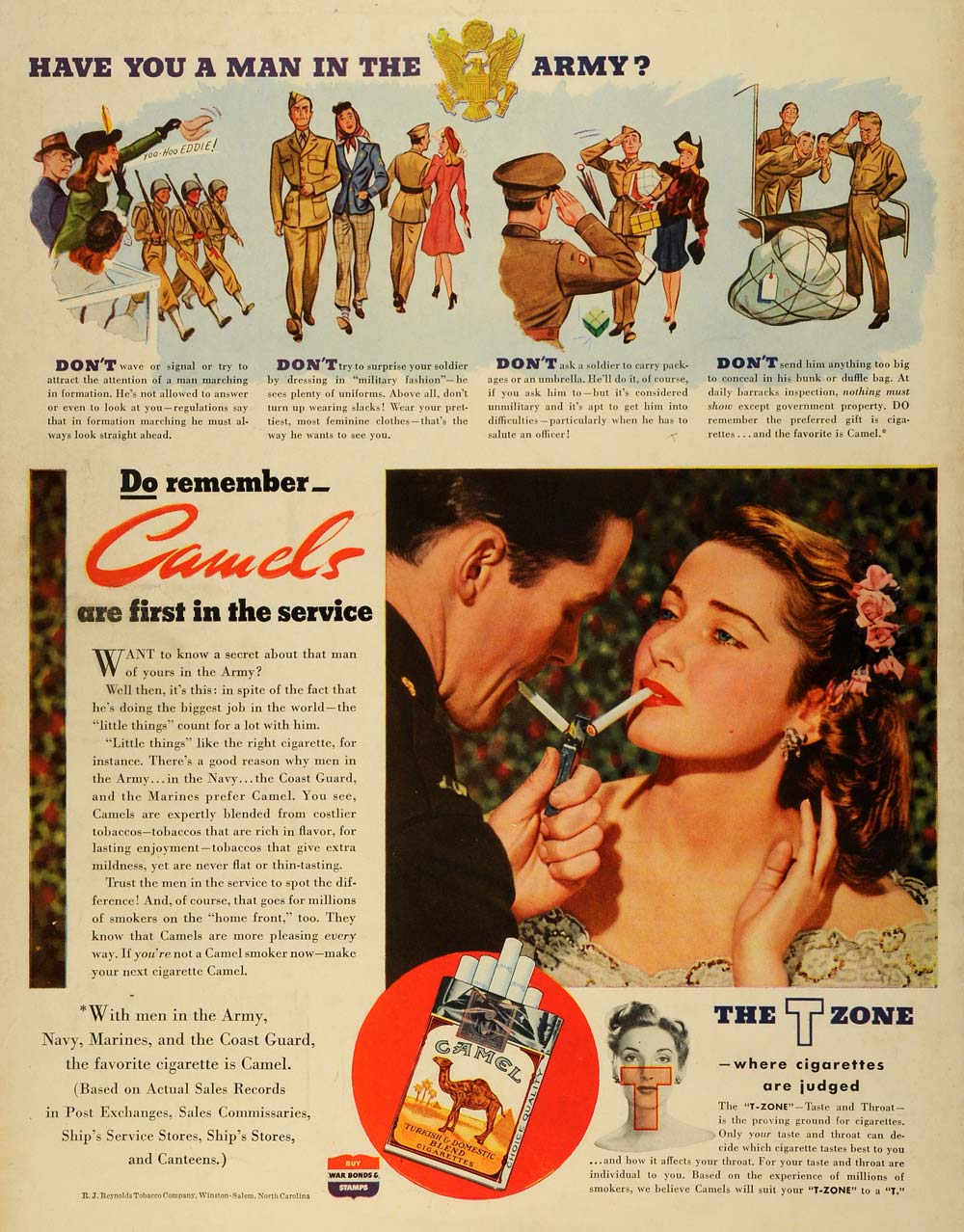 During World War I and World War II, soldiers received cigarettes in their war rations. When the war ended the soldiers returned addicted. In attempts to further increase cigarette popularity among the public, such tobacco companies as R. J. Reynolds would feature soldiers in their advertisements smoking cigarettes in the trenches.