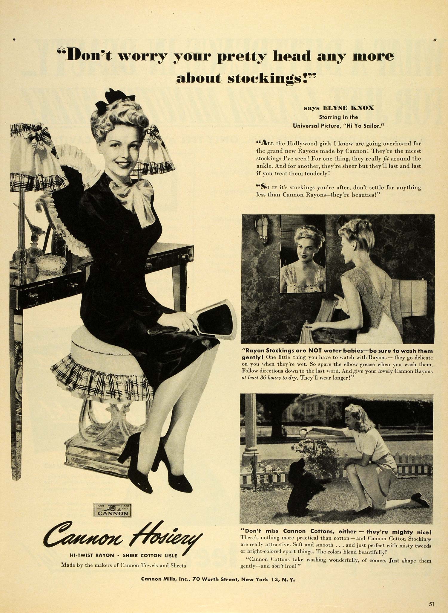This is an original 1943 black and white print ad for the Cannon Hosiery from Cannon Mills, Incorporation located at 70 Worth Street, New York City. This ad features images of the American Actress Elyse Knox.