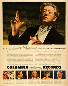 This is an original 1943 World War II Era black and white print ad for Columbia Masterworks Records, specially featuring prominent orchestra conductor Artur Rodzinski.