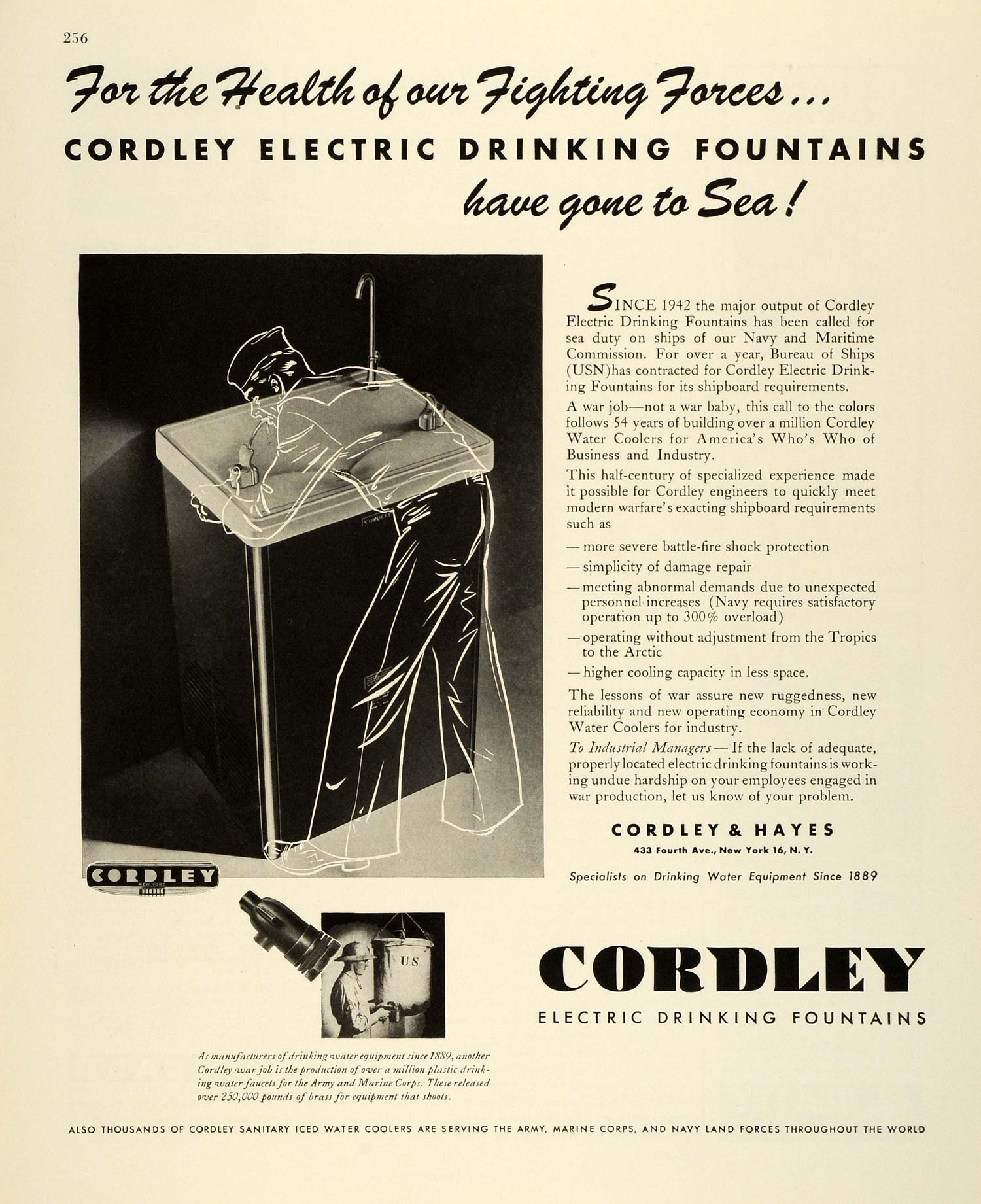 This is an original 1943 World War II black and white print ad for Cordley Electric Drinking Fountains, a product line by Cordley and Hayes, located at 433 Fourth Avenue in New York City.