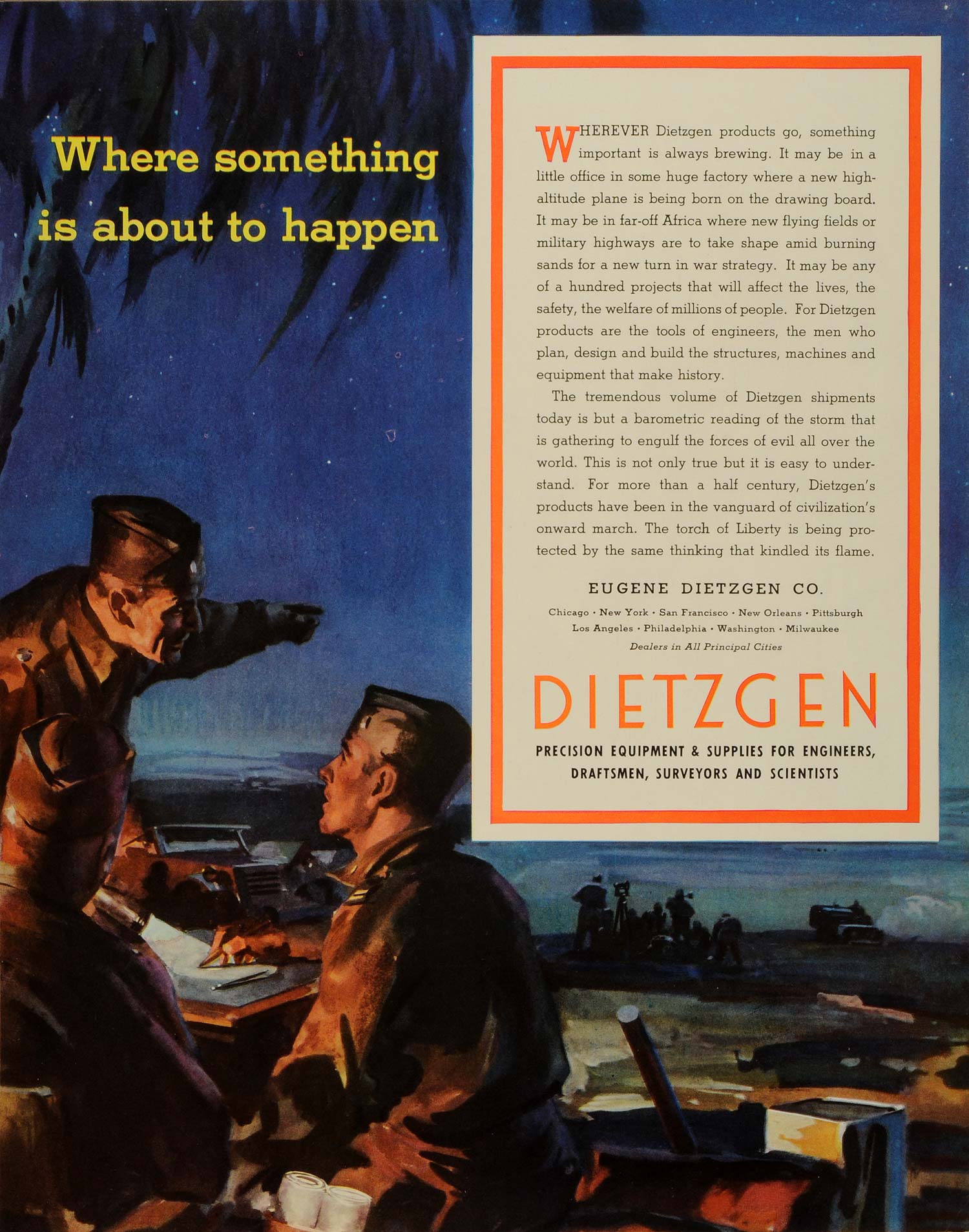 This is an original 1943 World War II color print ad for the Eugene Dietzgen Company, who are doing their part to aid in the war production efforts by manufacturing a surplus of their precision equipment and supplies for use by the military as well as wartime engineers, draftsmen, surveyors and scientists.