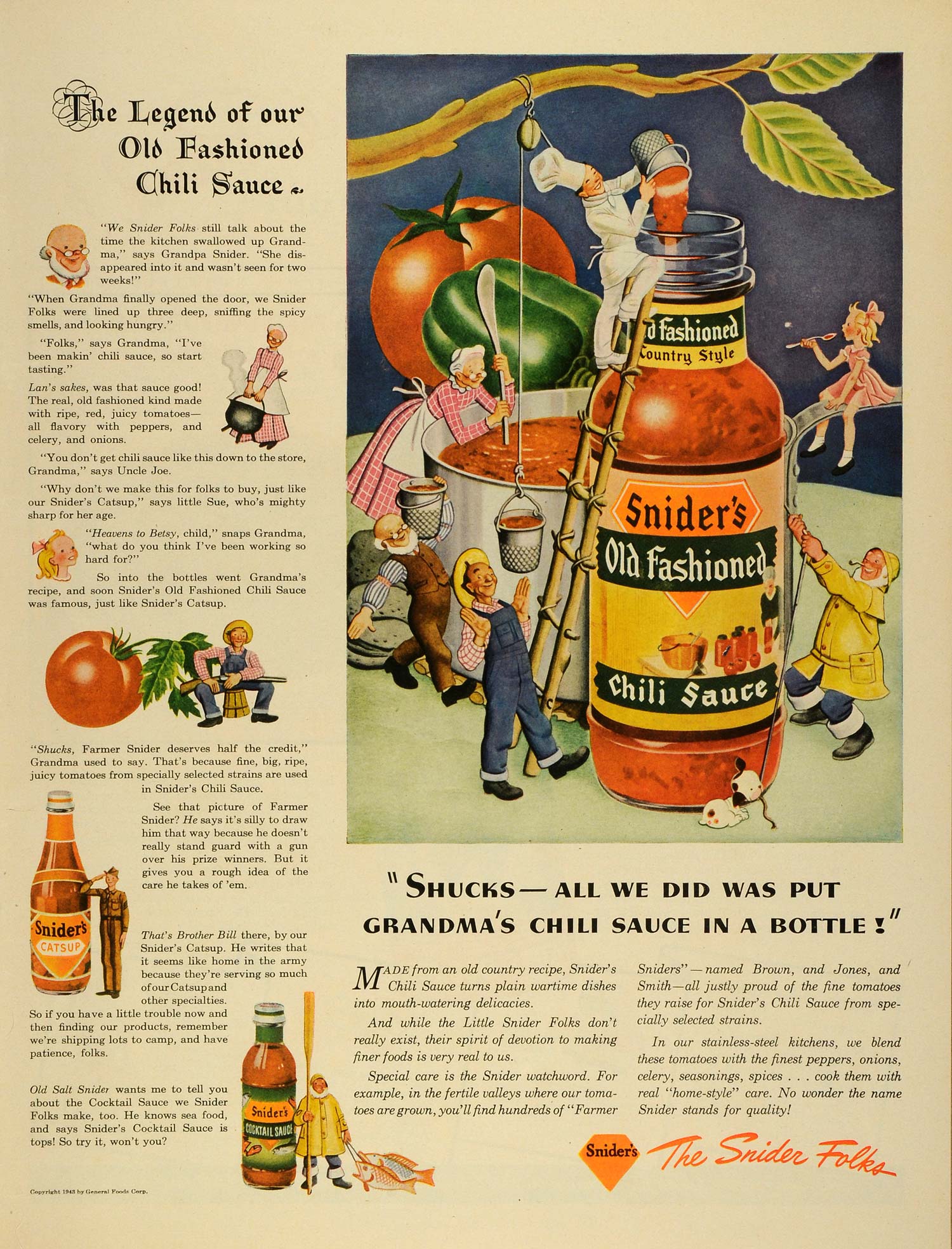 This is an original 1943 color print ad for the Snider's Old Fashioned Chili Sauce, Snider's Catsup, and Snider's Cocktail Sauce from General Food Corporation.