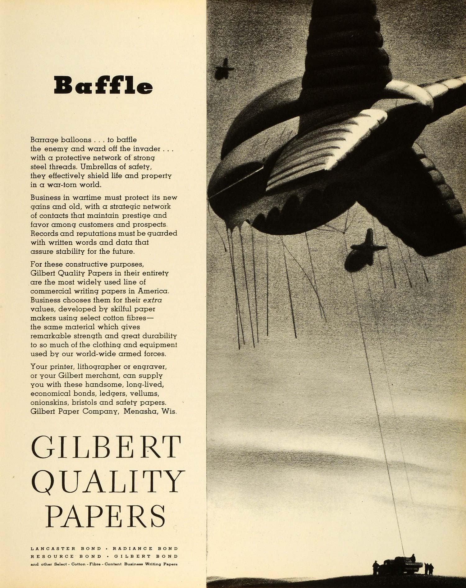This is an original 1943 World War II black and white print ad for Gilbert Quality Papers of Menasha, Wisconsin.