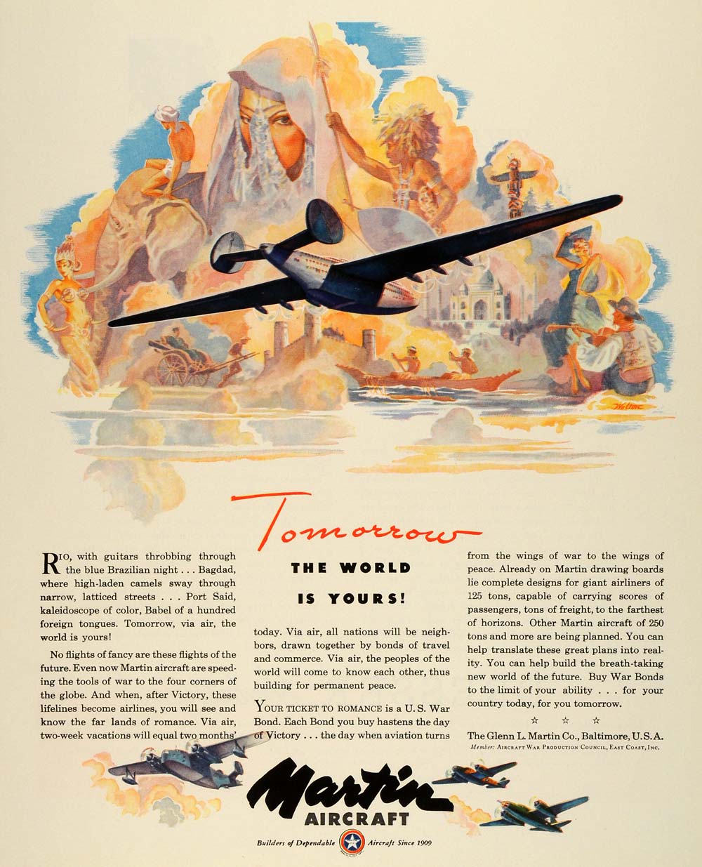 This is an original 1943 World War II color print ad for The Glenn L. Martin Company of Baltimore, Maryland, who are doing their part to aid in the war production efforts by manufacturing aircrafts for the U. S. military. This ad features artwork by Walton.
