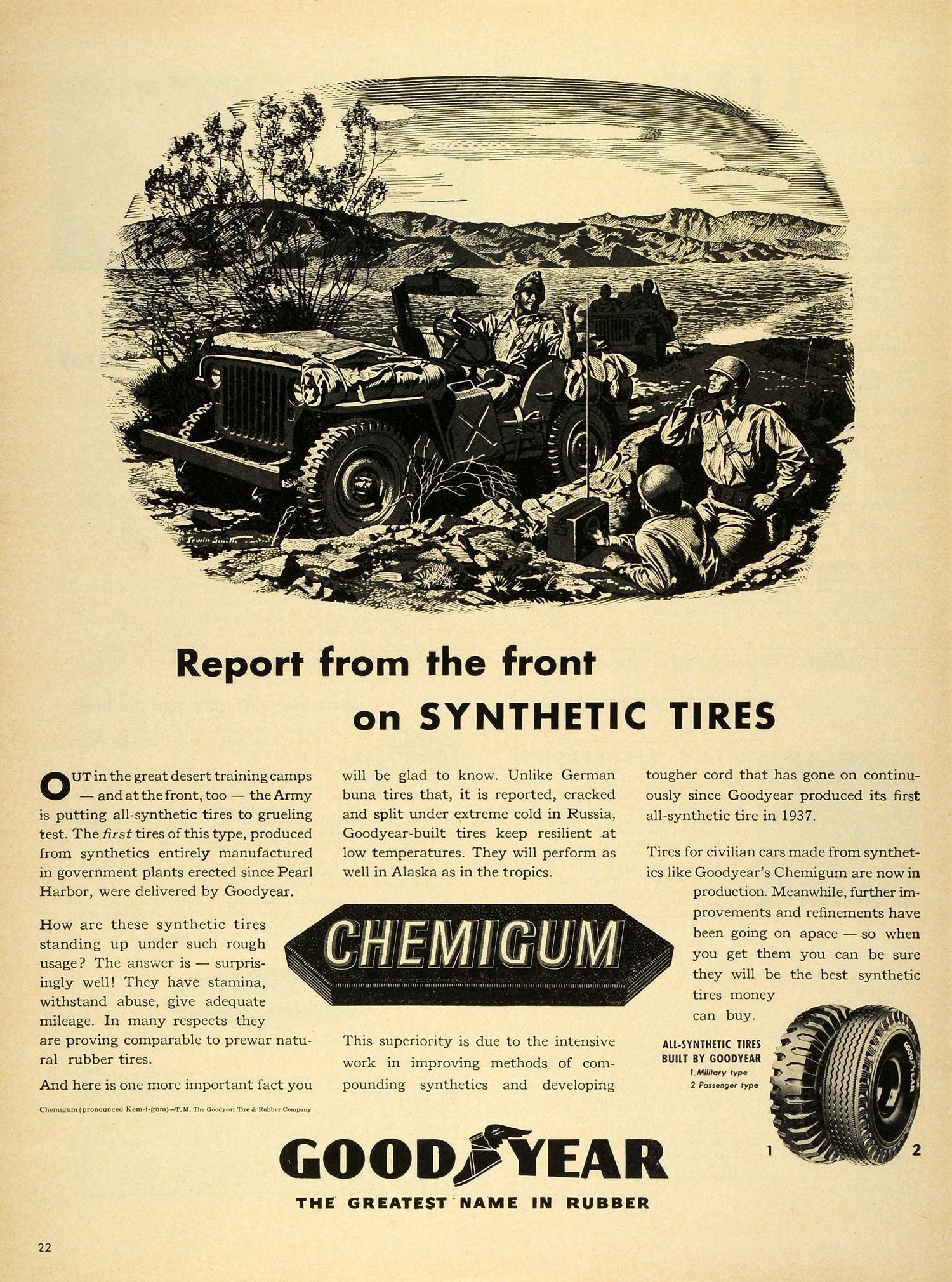 This is an original 1943 black and white print ad for the Goodyear's Chemigum from Goodyear Tire & Rubber Company.
