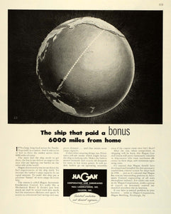 This is an original 1943 black and white print ad for the Hagan Automatic Combustion Control from the Hagan Corporation and Subsidiaries of Pittsburgh, Pennsylvania. The caption writes, "The ship that paid a bonus 6,000 miles from home."