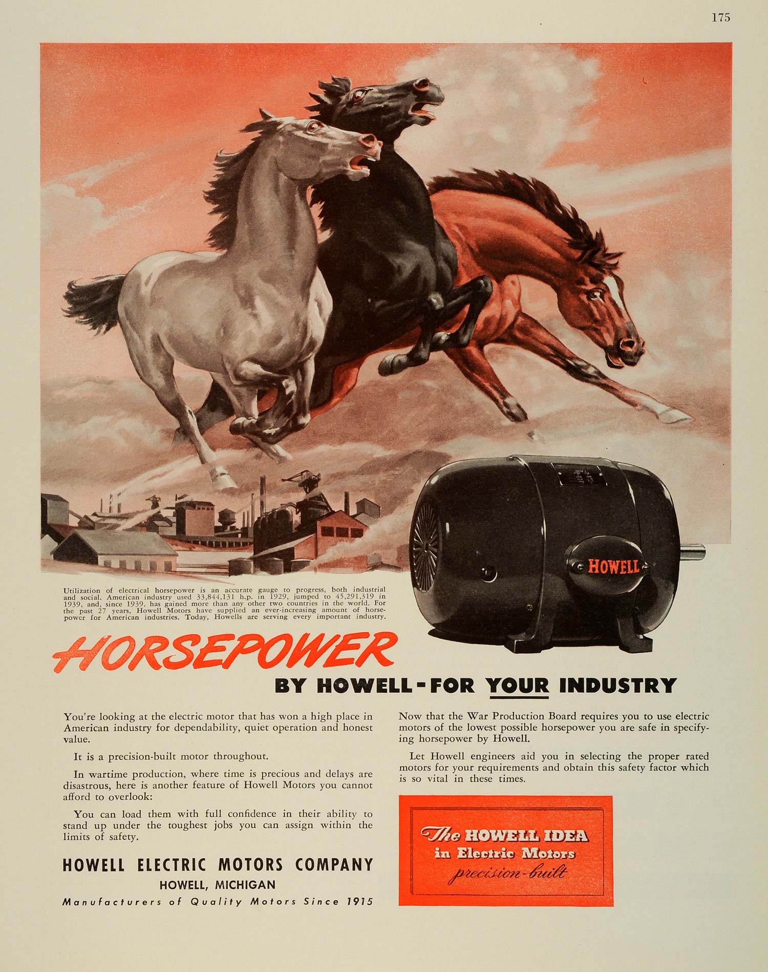 This is an original 1943 World War II two-color print ad for the Howell Electric Motors Company of Howell, Michigan, who are doing their part to aid in the war production efforts.