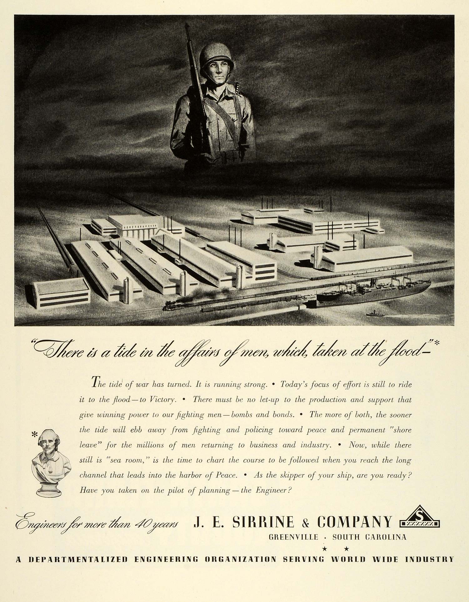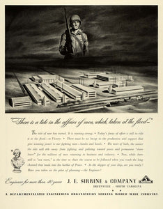 This is an original 1943 World War II black and white print ad for J. E. Sirrine and Company of Greenville, South Carolina.