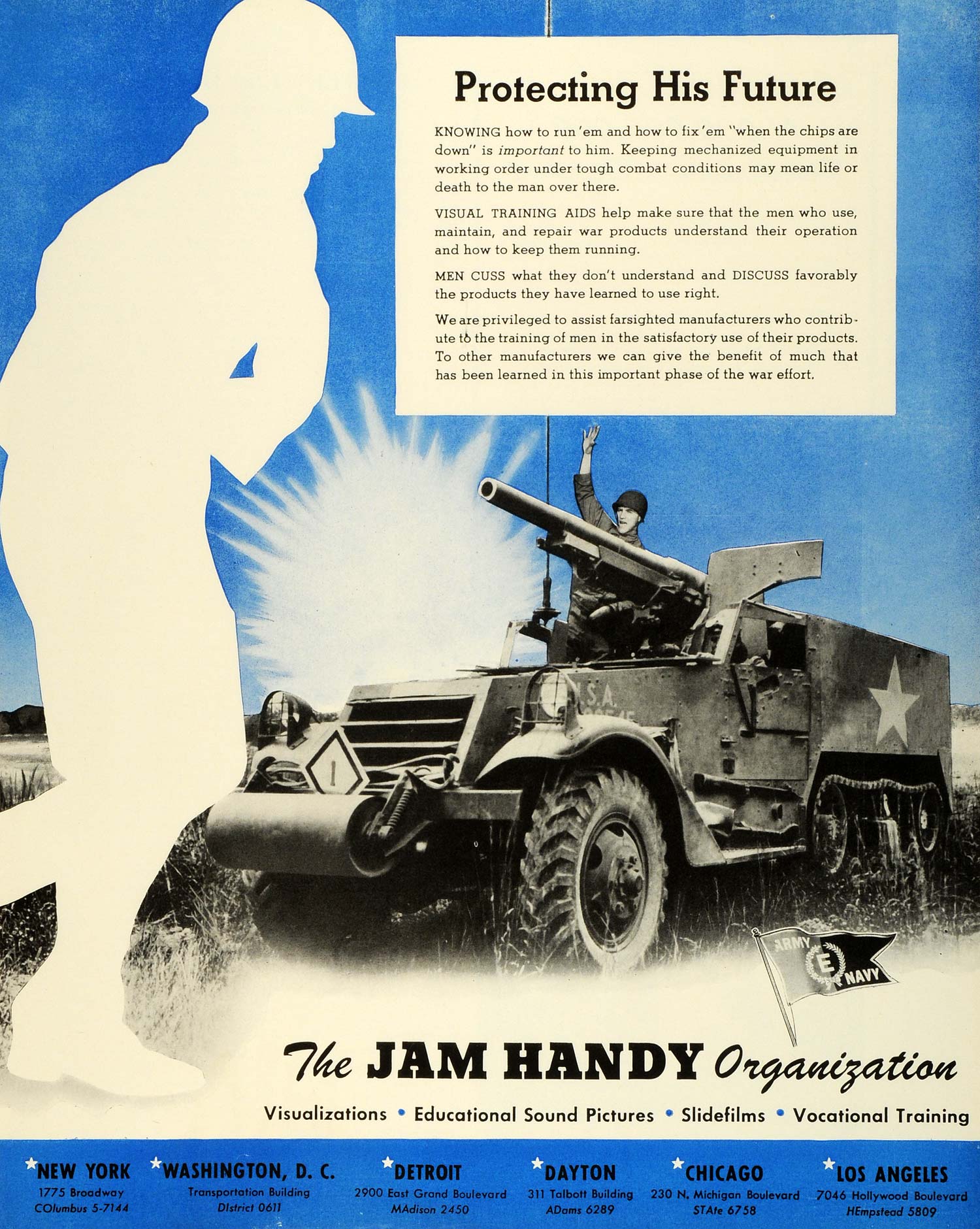 This is an original 1943 World War II two-color print ad for The Jam Handy Organization.
