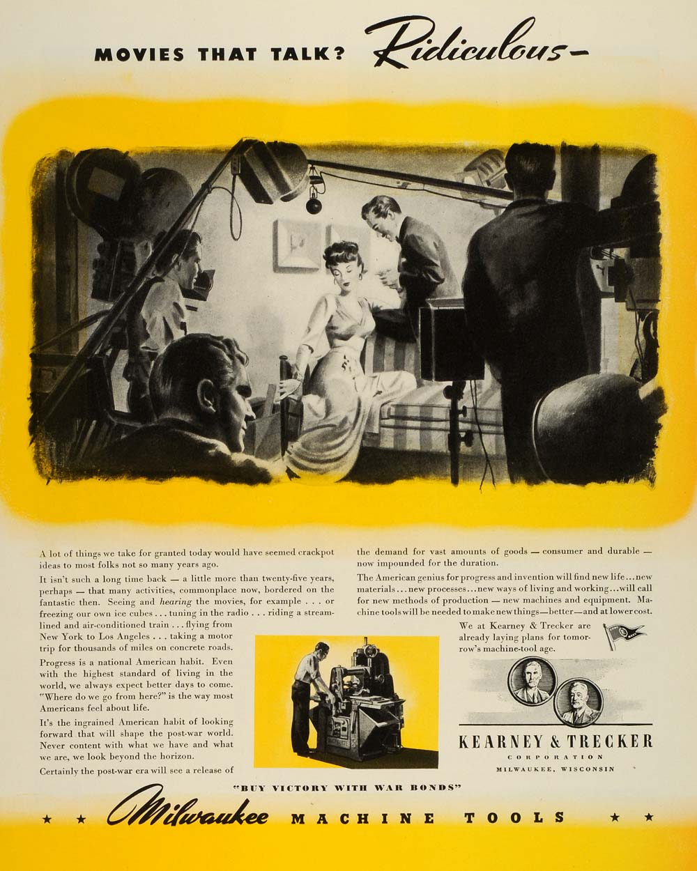 This is an original 1943 World War II two-color print ad for the Kearney and Trecker Corporation of Milwaukee, Wisconsin, who are doing their part to aid in the war production efforts by manufacturing a surplus of their tools.