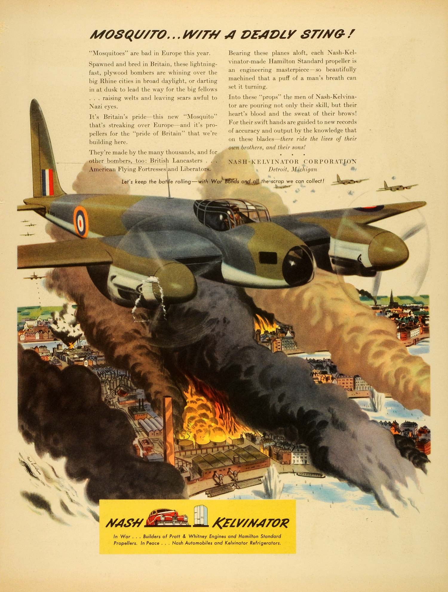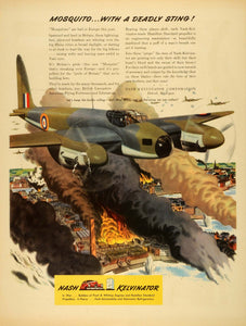This is an original 1943 color print ad for the Nash-Kelvinator Corporation of Detroit, Michigan. The ad features an image of a plane flying above a burning city. The company was the result of a merge between Nash Motors and the Kelvinator Appliance Company.