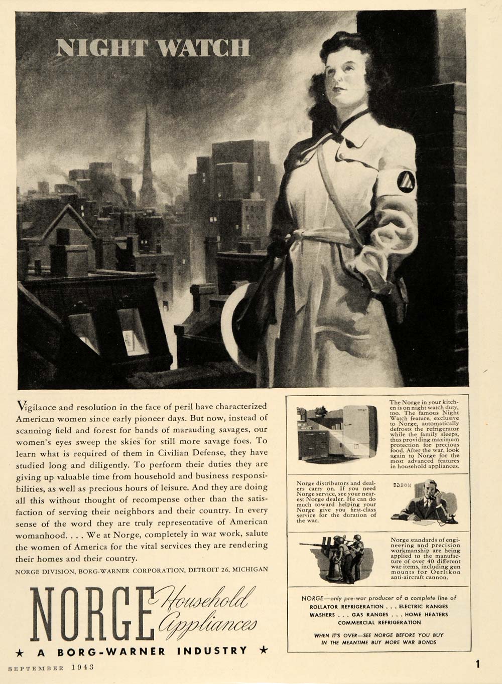 This is an original 1943 black and white World War II print ad for Norge Household Appliances from the Norge Division of the Borg-Warner Corporation of Detroit.