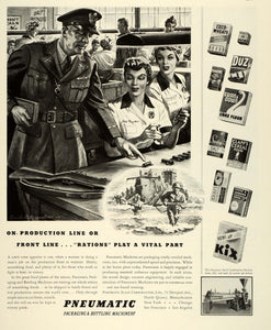 This is an original 1943 World War II black and white print ad for Pneumatic Packaging and Bottling Machinery by the Pneumatic Scale Corporation, located at 72 Newport Avenue in North Quincy, Massachusetts. This company is doing their part to aid in the war production and wartime shipping efforts by manufacturing a surplus of their supplies. This ad features artwork by Earl B. Winslow.